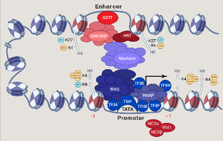 Alle zellulären und epigenetischen Signalwege führen letztlich zur Bindung der RNA-Polymerase II an spezifische Gen-Promotoren. Der basale Transkriptionsfaktor TFIID spielt dabei eine koordinierende Rolle bei der Regulierung der Transkriptionsinitiation. Wir untersuchen die Chromatin-Aspekte der dynamischen Regulation der TFIID-Aktivität.