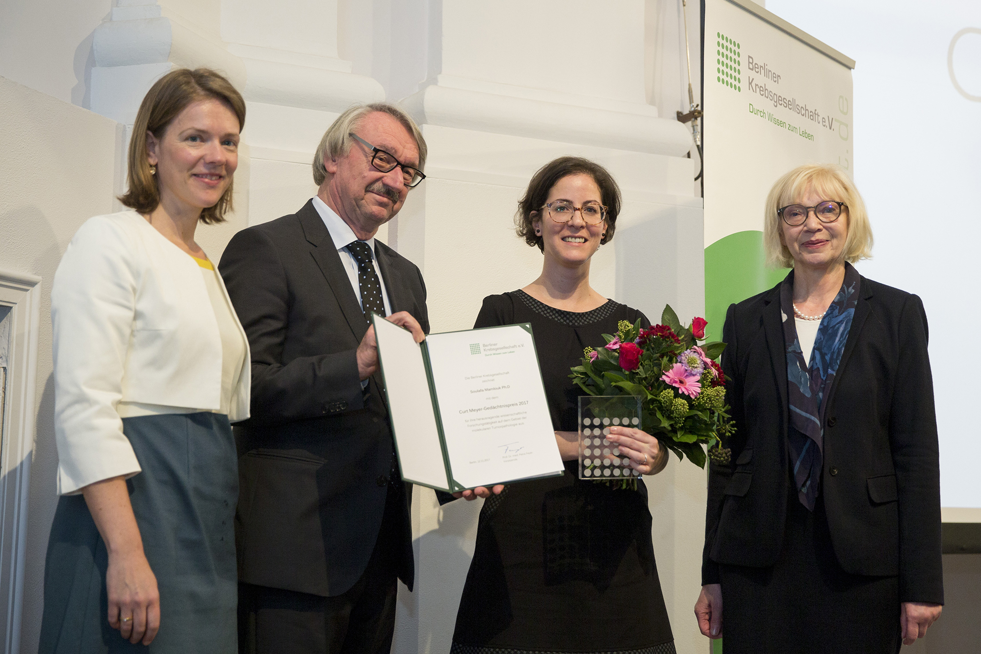 Caption: Winner Soulafa Mamlouk at the award ceremony on 12 November 2017: (f.l.t.r.) Kristina Zappel (Managing Director Berliner Krebsgesellschaft e.V.), Prof Dr Dr Günter Stock (Chairman Einstein Foundation Berlin), Soulafa Mamlouk Ph.D (German Cancer Consortium), Prof Dr Petra Feyer (Chairman Berliner Krebsgesellschaft e.V.). (© Berliner Krebsgesellschaft)
