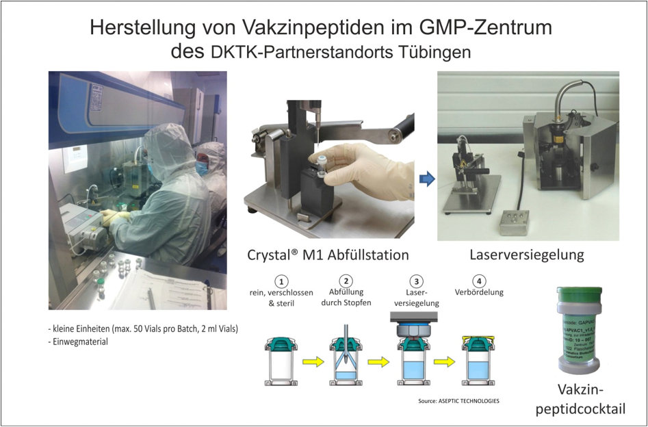 In Tübingen steht eine GMP-Einheit mit insgesamt sechs Reinräumen u.a. für die Herstellung von Peptiden zur Verfügung. Das „Wirkstoffpeptidlabor“ ist spezialisiert auf die effiziente Herstellung kleiner Peptidmengen in pharmazeutischer Qualität zum Einsatz in der personalisierten Peptidimpfung. DKTK Mitgliedern wird ein umfassender Service für Design und Produktion z.B. mutierter oder tumorspezifisch überexprimierter Peptide angeboten, welche durch NGS oder HLA-Ligandomanalyse identifiziert wurden. Tübinger Vakzinpeptide wurden bereits einigen klinischen Prüfungen verwendet wie z.B. in den DKTK-Studien „IVAC-ALL”, „iVAC-CLL01“, „AMPLIFY-NEOVAC“ oder “NOA-16”, sowie auch im Rahmen des EU-Projekts GAPVAC oder in der „B-pVAC-SARS-COV-2“-Studie des Universitätsklinikums Tübingen.