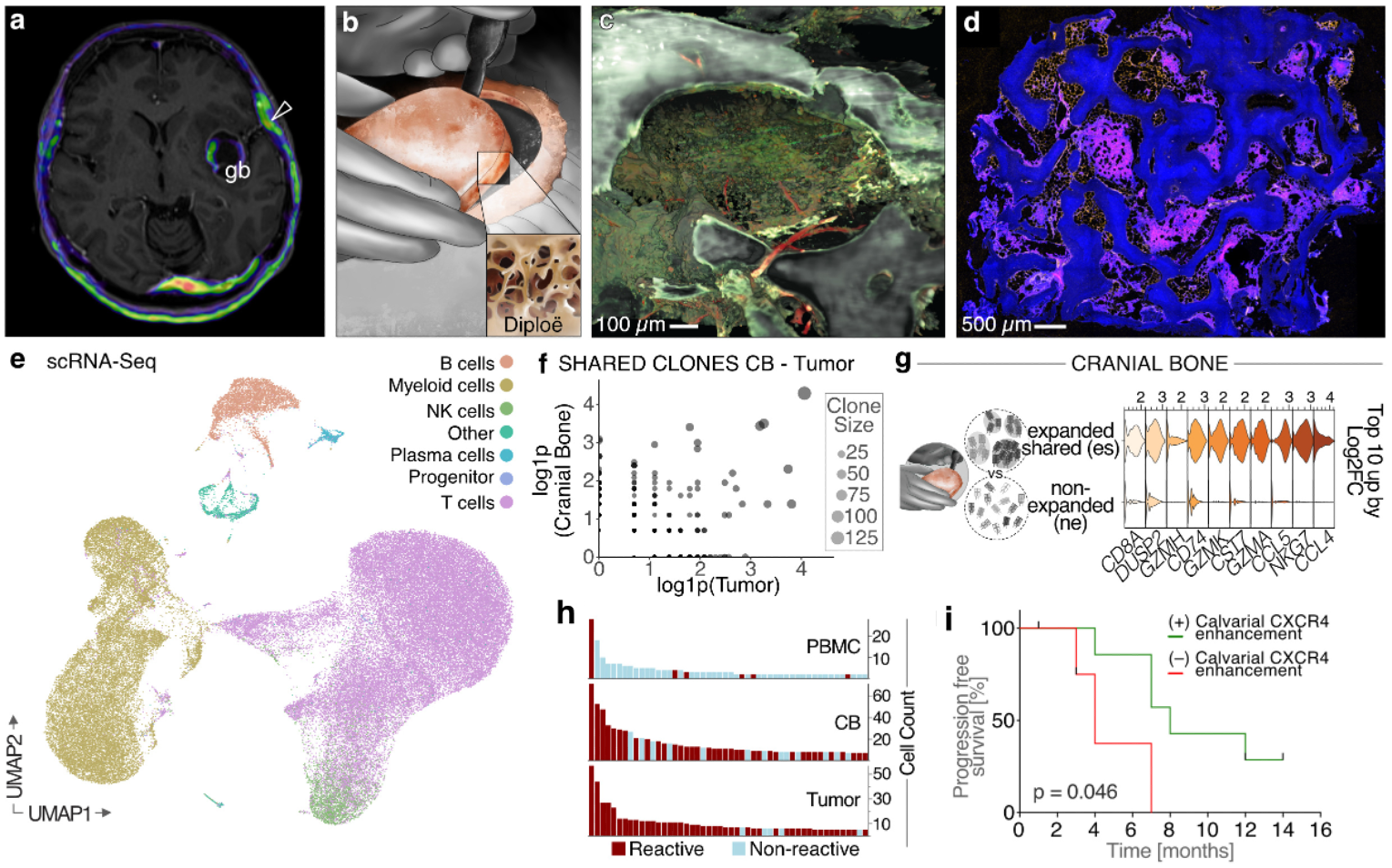 Ein zentraler Schwerpunkt unserer aktuellen Arbeit ist die Immunlandschaft an den Grenzflächen des Gehirns. Unsere Forschung hat wesentlich dazu beigetragen zu zeigen, dass Hirntumoren gemeinsam mit den angrenzenden Kompartimenten des Schädelknochenmarks und der Hirnhäute eine aktive hämatopoetische und immunologische Nische bilden. Dieses kraniale Immunmilieu steht in direkter funktioneller Verbindung zum zentralen Nervensystem und beeinflusst Tumorevolution, immunologische Überwachung und das therapeutische Ansprechen.
