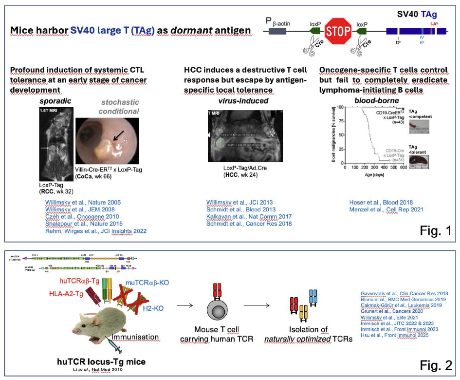 Krebszellen können von T-Zellen erkannt werden, was durch den Erfolg von Checkpoint-Inhibitoren wie Anti-CTLA-4 (anti-cytotoxisches T-Lymphozyten-Antigen 4) und Anti-PD-1 (anti-programmed death 1) eindrucksvoll bestätigt wurde. Ob destruktive oder nicht-destruktive spontane T-Zell-Antworten im autochthonen Wirt ausgelöst werden, hängt von den Entzündungsbedingungen ab, unter denen die Tumore entstehen. So zeigte die primäre Krebsentwicklung mit konditionaler Krebsantigenexpression mittels Cre/LoxP-System in genetisch veränderten Mausmodellen einerseits eine ausgeprägte tumorausgelöste systemische Toleranz bereits im prämalignen Stadium sporadischer Tumore. Andererseits konnte die Induktion systemischer Immunität, aber lokale, antigenspezifische zytotoxische T-Zell-Toleranz (CTL) bei virusinduzierten Tumoren beobachtet werden. Beim Zusammenwirken von CD4-T-Zellen in Klasse-I- und Klasse-II-doppelpositiven Lymphomen fanden wir eine Art Immunüberwachung (Abb. 1).